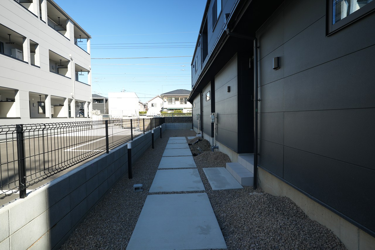 敷地全体にゆとりがあり、玄関側にも余白を確保。さらに、ガレージ前の通路や前面道路幅も広いため、SUVやスーパーカーなどの大型・低車高車でもストレスなく駐車・出庫が可能。愛車を大切にされるオーナー様にこそふさわしい邸宅です。