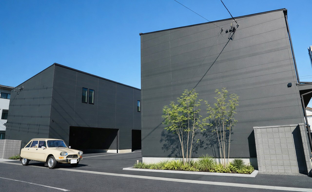 駅徒歩2分、全邸並列2台ガレージ。趣味も暮らしも妥協しない、大人のためのガレージハウスが埼玉県加須市花崎町に誕生。広々とした敷地に余裕の並列2台ガレージハウス。