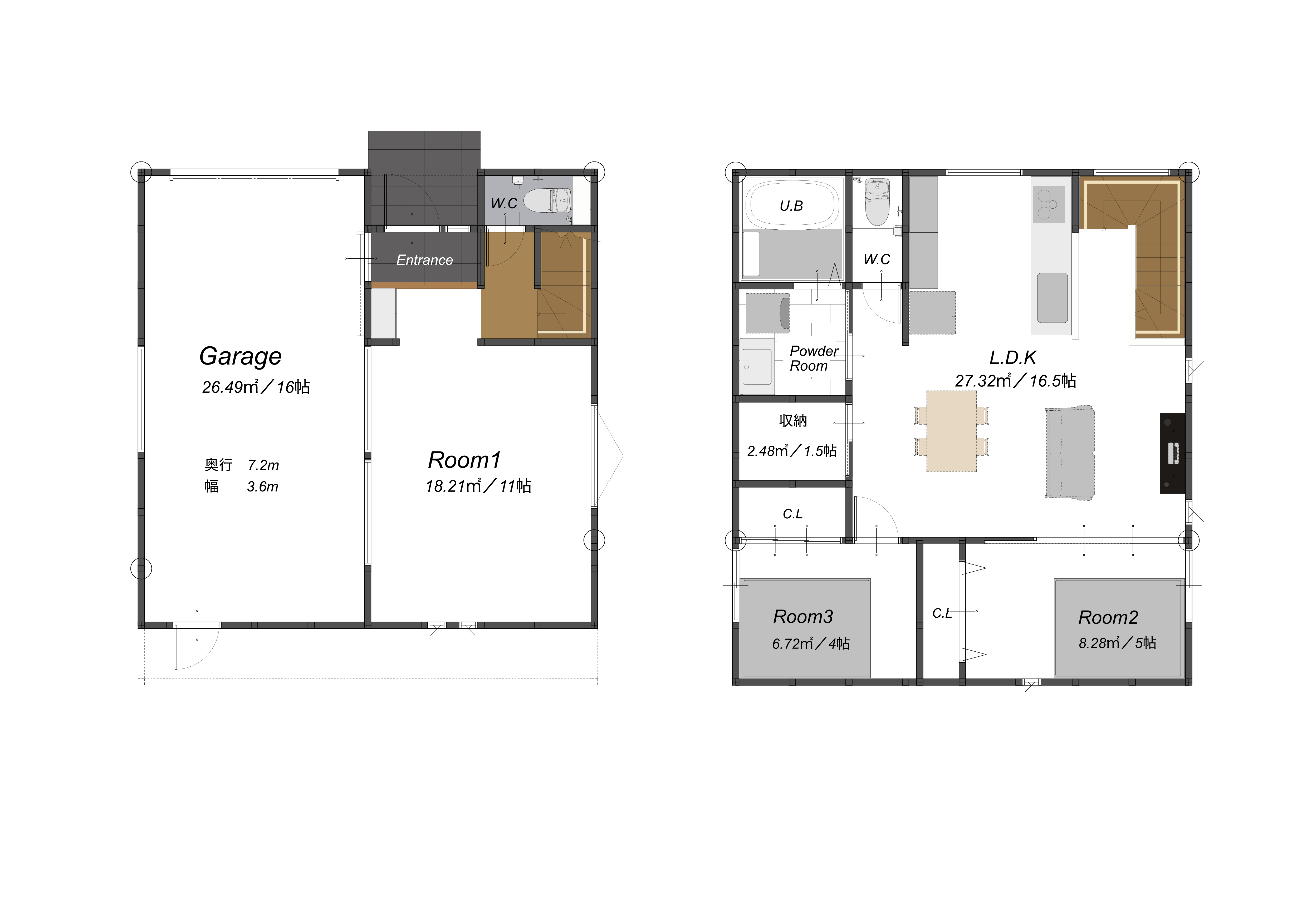 ガレージ (26.5㎡) LDK (27.3㎡) Room1 (16.6㎡) Room2 (8.3㎡) Room3 (7.9㎡) |